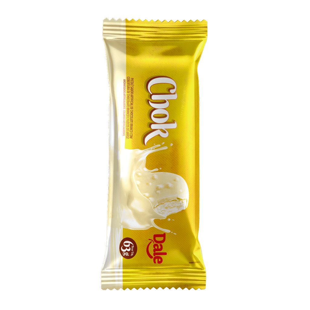 Picolé sabor artificial de chocolate branco com cobertura de chocolate branco flocos de arroz – 60g.