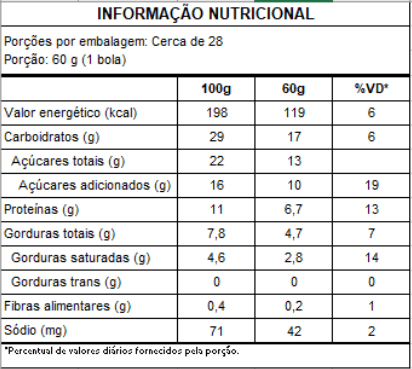 Sorvete de chocolate (leite pasteurizado, açúcar, glicose, gordura vegetal de palma, leite em pó desnatado, soro de leite, maltodextrina, amido, leite em pó integral, cacau, emulsificante mono e diglicerídeos de ácidos graxos, espessantes goma guar, carboximetilcelulose e carragena, antiumectante fosfato tricalcico e aromatizantes), sorvete de flocos (leite pasteurizado, açúcar, gordura vegetal de palma, xarope de glicose, leite em pó desnatado, soro de leite, recheio de chocolate (gordura vegetal, açúcar, cacau em pó, sal, emulsificantes lecitina de soja e polirricinoleato de poliglicerol), maltodextrina, amido de milho, leite em pó integral, estabilizante mono e diglicerídeos de ácidos graxos, espessantes goma guar, carboximetilcelulose e carragena e aromatizantes).